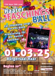 Der Faschingsball der CSU Haar rückt näher und ist einer der gesellschaftlichen Höhepunkte der närrischen Zeit.📅 Samstag, 14. Februar 2026 Freuen Sie sich auf einen festlichen Abend in geselliger Atmosphäre mit guter Musik, Tanz und zahlreichen Gelegenheiten zum Austausch. Der Ball bietet Raum für Begegnungen, Gespräche und ausgelassene Faschingsstimmung. Sichern Sie sich noch schnell Ihre
