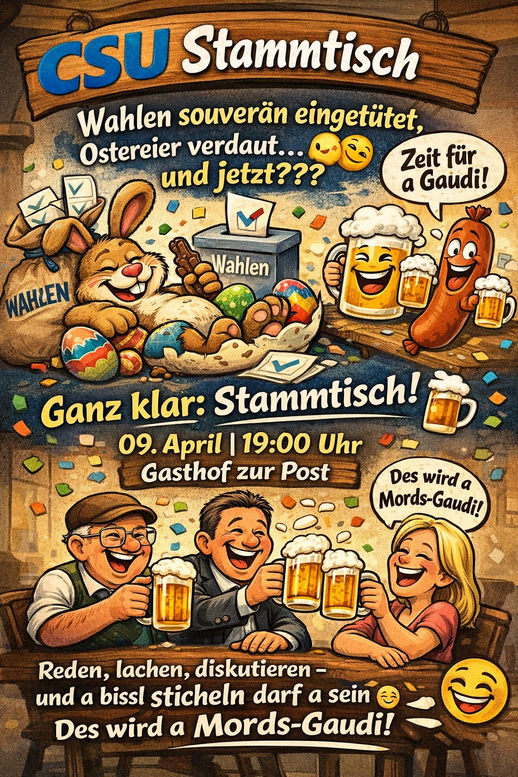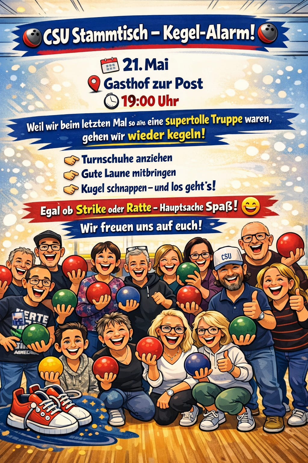 Bitte merken Sie sich zudem bereits den 21. Mai um 19:00 Uhr vor: An diesem Termin laden wir zu einer weiteren Veranstaltung – diesmal in der Kegelbahn des Gasthof zur Post – ein. Auch hier freuen wir uns auf Ihre Teilnahme und einen gemeinsamen Abend in geselliger Runde.