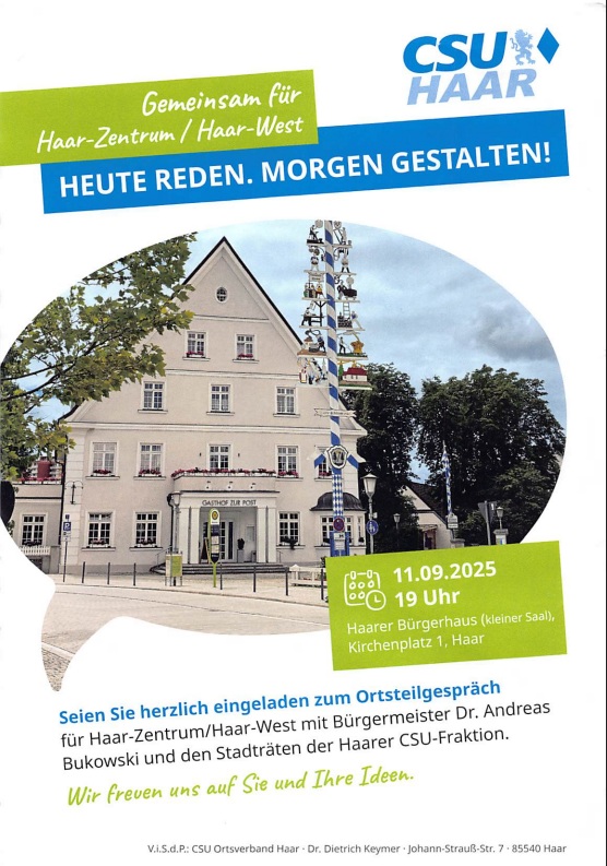 Die CSU Haar lädt alle Bürgerinnen und Bürger herzlich zum Ortsteilgespräch für Haar-Zentrum und Haar-West ein. Am Mittwoch, den 11. September, um 19:00 Uhr im Bürgerhaus (kleiner Saal), Kirchenplatz 1, 85540 Haar, haben Sie die Gelegenheit, direkt mit Bürgermeister und Mitgliedern der CSU-Stadtratsfraktion ins Gespräch zu kommen. Nutzen Sie die Möglichkeit, Fragen zu stellen, Anregungen einzubringen und sich über aktuelle Themen in unserer Gemeinde auszutauschen. Wir freuen uns auf Ihr Kommen und auf einen offenen Dialog!