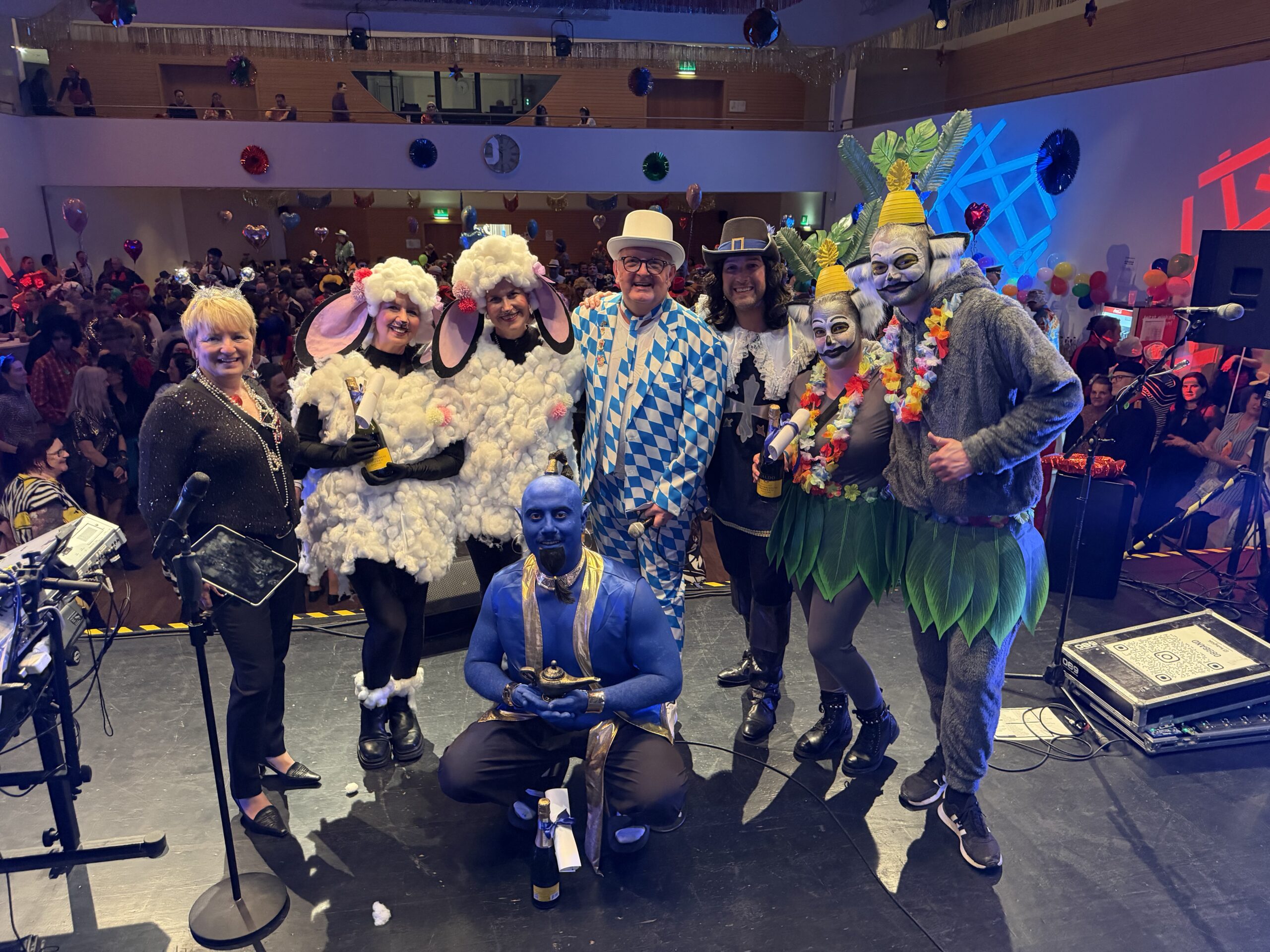Die Gewinner der Kostümprämierung von links nach rechts : Christine Jelic Mitglied des Planungs-Komitees, Schafe : Manuela Lange und Yvonne Müller, Alois Rath Mitglied des Planungskomites, Bürgermeister Dr. Andreas Bukowski, Lemuren Olivia und Bernhard Lehner, Bildmitte Knieend Sika Elhag , Dschini der Flaschengeist